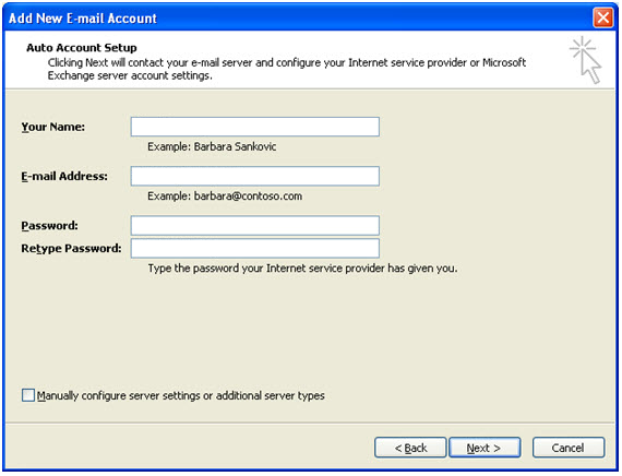 Make sure "Manually configure server settings" is not selected. Then click Next.
