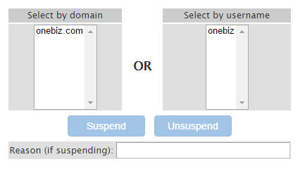 Select the account in question by clicking on either the username or the main domain on the account. If you are suspending an account, you can place a note in the box to help remember why it was suspended.